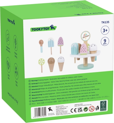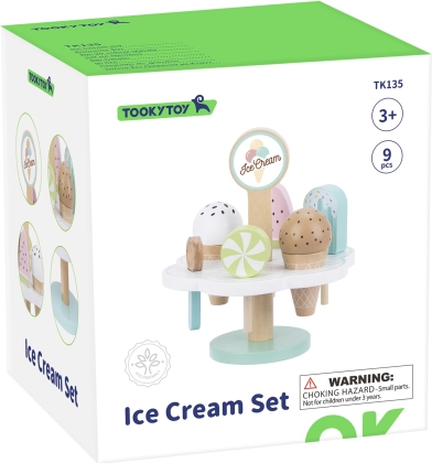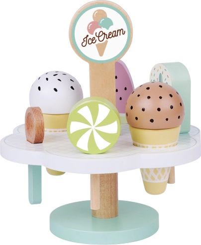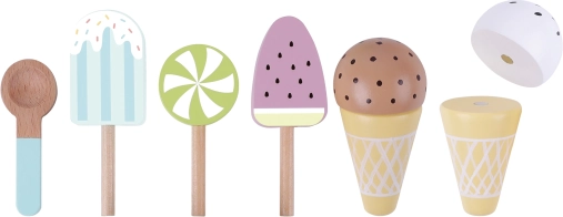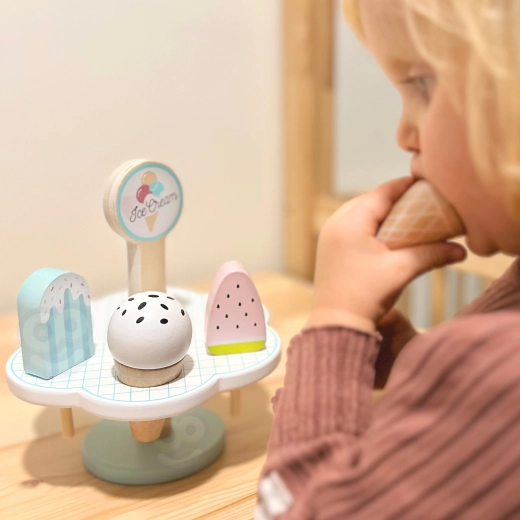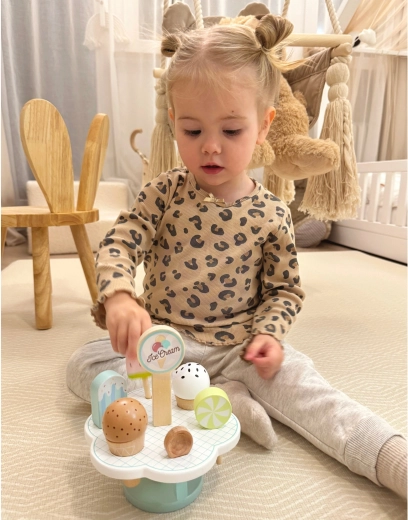 Ta čudovit lesen komplet sladoledov je idealen za otroke, ki imajo radi ustvarjalno igro. Pastelne barve in skrbna izdelava zagotavljajo ure zabave pri igri prodajalca sladoleda ali kot oprema otroške kuhinje. Zdrava izbira za razvoj otrokove ustvarjalnosti in socialnih veščin. Magneti zagotavljajo stabilnost, kar naredi igro še prijetnejšo.