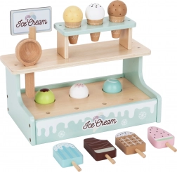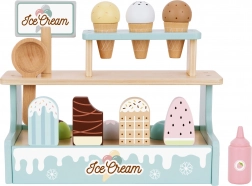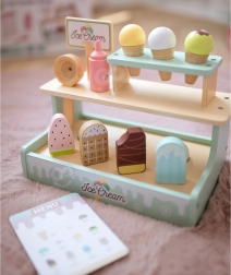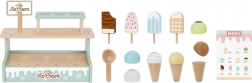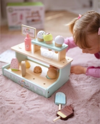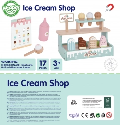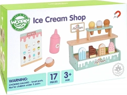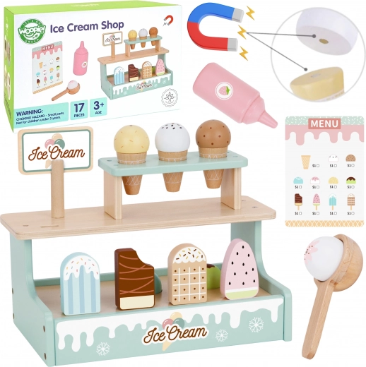 Odkrijte čar igre trgovine s stilno sladoledno stojnico WOOPIE GREEN. Otroci lahko strežejo kepičaste in paličaste sladolede, zlagajo okuse zahvaljujoč magnetnim kepicam in izbirajo iz ponudbe na meniju. Igra razvija koordinacijo oko–roka, kreativnost in socialne veščine pri strežbi strank.
