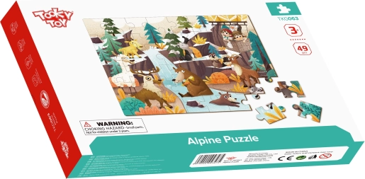 Sestavljanka Tooky Toy Alpe - Živali in pokrajina je odlično darilo za otroke. Vsebuje 49 koščkov, ki pomagajo spoznavati živali in rastline alpske pokrajine. Popolna kot prva sestavljanka za vašega malčka.