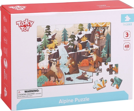 Sestavljanka Tooky Toy z alpsko tematiko predstavlja zabaven način, kako otroke učiti o naravi in geografiji. Sestavljena je iz 49 koščkov in prihaja v praktični vrečki, ki jo lahko pozneje uporabite kot spominsko potovalno vrečko. Igrača je izdelana iz lesa in pobarvana z netoksičnimi barvami, kar zagotavlja varnost otrok pri dolgih urah zabave. S svojo barvitostjo in ilustracijami pritegne pozornost ter spodbuja otroško domišljijo.
