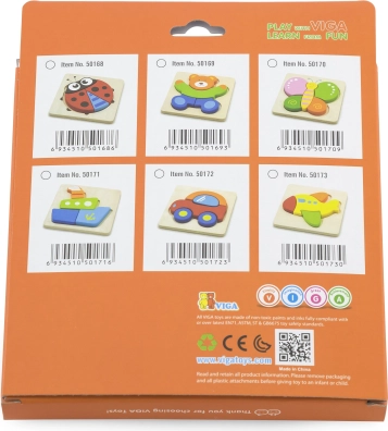 Vsaka sestavljanka ima drugačno obliko – letalo, pikapolonica, avto in metulj – kar spodbuja koordinacijo in kognitivne sposobnosti.