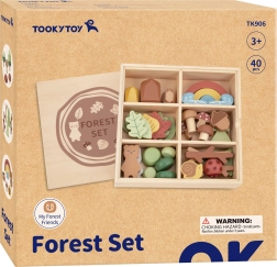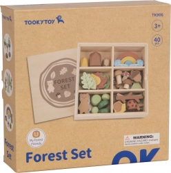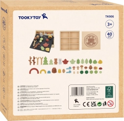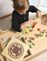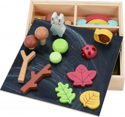 Komplet je shranjen v praktični leseni škatli, katere zadnja stran pokrova je ustvarjena kot tabla.