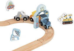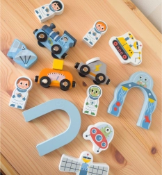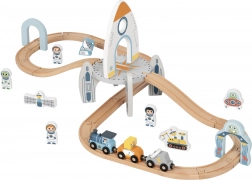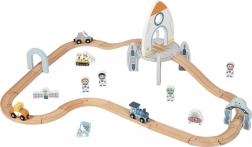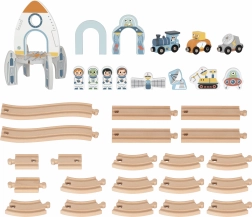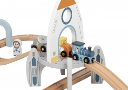Ta lesena vesoljska vlakovna proga otroke popelje v svet vesolja s tematskimi elementi, kot so figurice astronavtov, vesoljska sonda, rover in leteči krožnik. Večnivojska postavitev prog daje igri dinamiko. Osrednji element proge je velika vesoljska raketa, ki služi kot dekorativni in konstrukcijski del.
