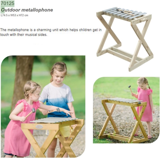 Odkrijte veselje do glasbe pod širnim nebom. Robustni leseni okvir in kovinske tipke zagotavljajo čist, resonanten ton in dolgo življenjsko dobo tudi pri pogosti zunanji uporabi. Metalofon je idealen za vrtce, igrišča in domače vrtove – otroci vadijo koordinacijo, sluh in ritem ter hkrati krepijo samozavest in pogum nastopiti z lastno melodijo.
