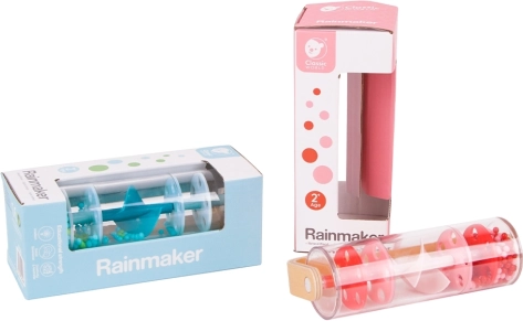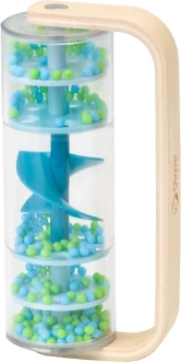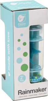 Pomirjujoča glasbena igrača za najmlajše: modra dežna palica znamke CLASSIC WORLD združuje les in prozorno plastiko; barvite kroglice v notranjosti se presipajo in ustvarjajo nežen zvok dežja. Dovolj jo je pretresti ali zavrteti za 360° in v hipu se spremeni v zabavno ropotuljico/zvonček, idealno za čutni razvoj in prva ritmična vajenja.