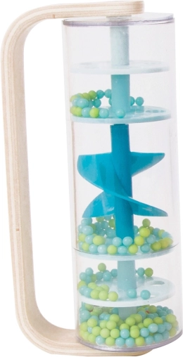 Zaobljen lesen ročaj odlično leži v roki. Igračo lahko stresamo, nagibamo in vrtimo za 360° kot zabavno ropotuljico.