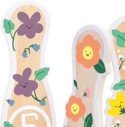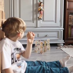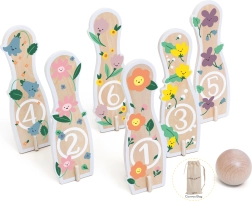 Priljubljena otroška igra v bowling slogu v lepem naravnem videzu. Keglji so izdelani iz kakovostnega lesa in okrašeni z veselimi cvetovi ter številkami, zato otroci naravno vadijo štetje in vidno zaznavanje. Kompakten komplet se zlahka prenaša v priloženi vrečki – idealno za dom in na pot.