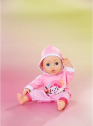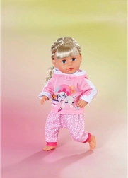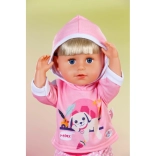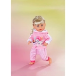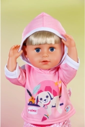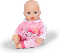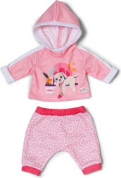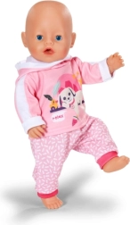 Ta rožnata trenirka je popoln dodatek garderobi punčk BABY born 43 cm in medvedkov BABY born Teddy. Kapucar z ljubkim potiskom počivajočega kužka in prijetne hlače z nežnim vzorcem zagotavljajo udobje pri vsaki pustolovščini. Zaradi premišljenega kroja se oblačilo zlahka obleče in sleče.