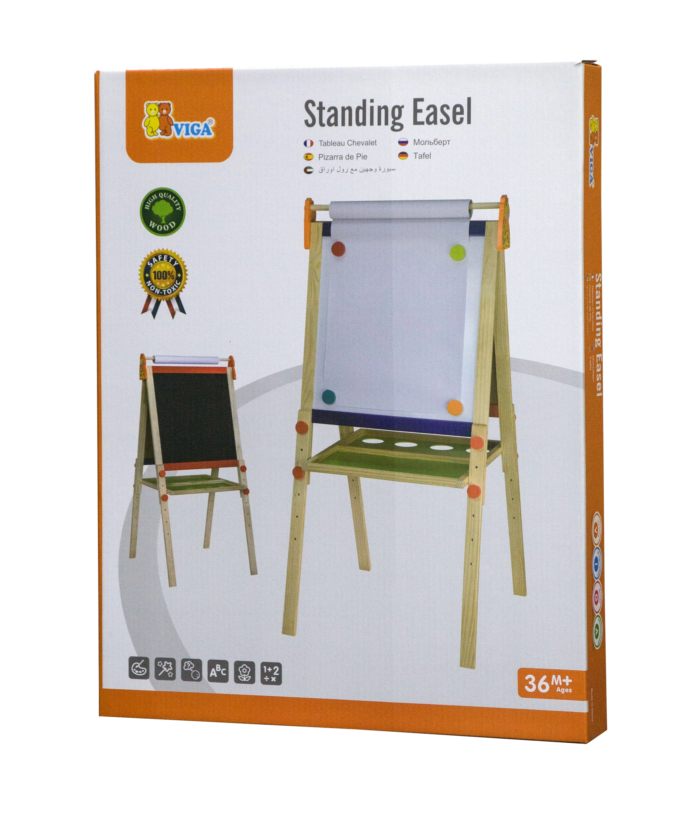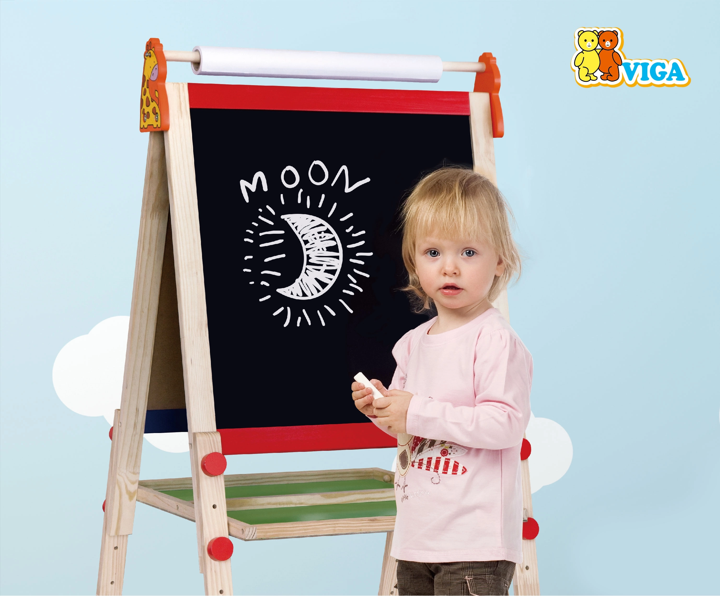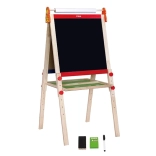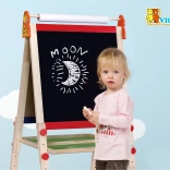 Podprite otroško ustvarjalnost z dvostransko magnetno tablo Viga – na eni strani kredna tabla, na drugi bela piši-briši površina. Stabilno leseno stojalo, rola papirja za risanje in praktično priloženo dodatki jo naredijo idealno darilo za male umetnike.