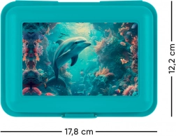 Posoda za malico je okrašena s pisanim in igrivim motivom delfina in koralnega grebena, ki pritegne vse starostne skupine.