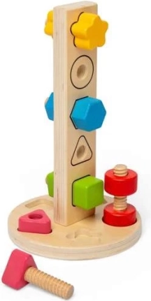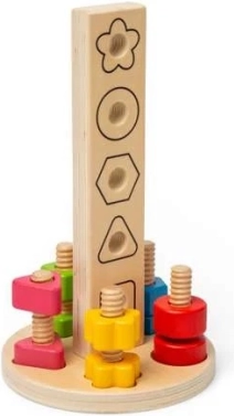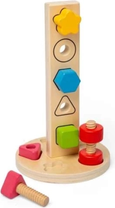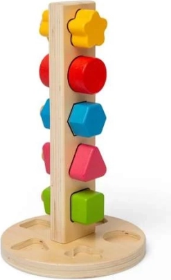 Ta pametna izobraževalna igrača združuje zabavo in učenje. Otroci lahko privijajo barvite oblike na količek, jih razvrščajo po obrisih na osnovi ter urijo logično razmišljanje in prostorsko zaznavanje. Trpežna lesena izvedba in varne barve zagotavljajo dolgo življenjsko dobo in brezskrbno igro.