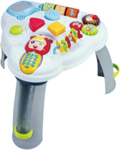 Interaktivna izobraževalna mizica za najmlajše združuje zabavo in učenje v enem. Zahvaljujoč svetlobnim učinkom, zvokom in melodijam ter številnim premičnim elementom razvija fino motoriko, koordinacijo oko–roka in logično mišljenje. Del kompleta je interaktivni telefon na baterije, barvni gumbi, vrtljiva kolesca in liki za razvrščanje – idealna izbira že od približno 6 mesecev.
