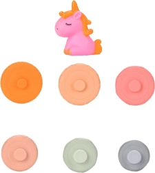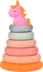 Ta komplet vsebuje sedem elementov, vključno s prikupnim enorogom in šestimi mehkimi obročki, ki jih je mogoče poljubno sestavljati in prilagajati. Vsak obroč ima unikatne vzorce in teksture, vključno s številkami in črkami, kar spodbuja razvoj otipa in zgodnje učenje skozi igro.