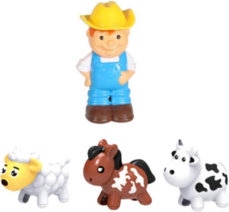 Set vključuje plastične figurice kmeta in živali, ki so lahke in prilagojene otroškim potrebam za zabavno kmečko igro.