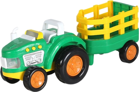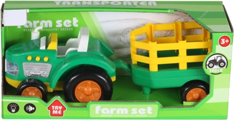 Ta kmečki set vsebuje zeleni traktor z rumeno prikolico ter figurice kmeta in živali. Traktor ima realističen videz s svetlobnimi in zvočnimi učinki, ki navdušijo vsakega malega ljubitelja voznih igrač. Luči svetijo, zvoki pa se aktivirajo s pomočjo gumbov na strani traktorja.