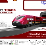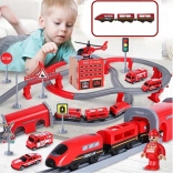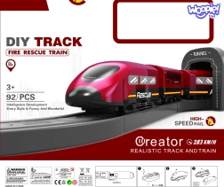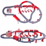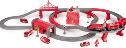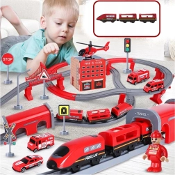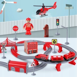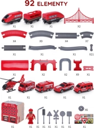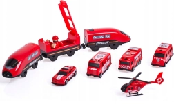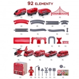 V paketu so lokomotiva (2× AAA, niso priložene), 2 vagona, 4 gasilska vozila, helikopter, figurica gasilca, depo, most, tunel, tiri, opore in prometna signalizacija. Kombinacija železnice in cestne reševalne tehnike podpira koordinacijo oko–roka, prostorsko orientacijo in pripovedno igro.