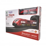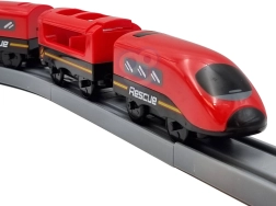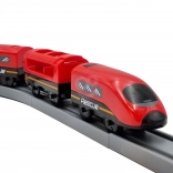 Moderna baterijska lokomotiva (2× AAA, niso priložene) vozi po bogato opremljeni progi z mostom in tunelom za še bolj realističen doživljaj.