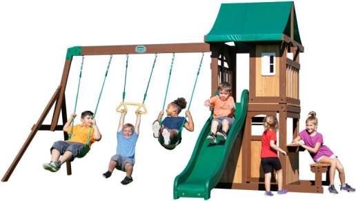 Kompaktno zunanje igrišče BACKYARD DISCOVERY Lakewood prinaša otrokom neskončno zabavo tudi na manjših vrtovih. Ponuja dve gugalnici, trapez za male akrobate, dvignjeno igralno platformo z barvitim senčnikom, prava vrata in okno s klopjo in predvsem hiter 244‑cm tobogan. Odporna cedrova konstrukcija in premišljene podrobnosti zagotavljajo varno igro za otroke od 3 let naprej.