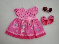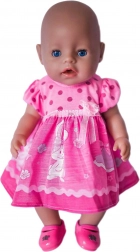 Stilna rožnata oblekica s pikicami in motivom zajčka punčki doda edinstven videz ter spodbuja igrivo domišljijo otrok.