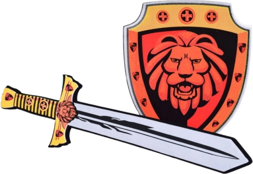 Lahka viteška seta za otroke ponuja penast meč in ščit z izrazitim levjim grbom. Varna pena blaži udarce, zato je igra dinamična, a brez modric. Idealno za otroške igre in kostume.