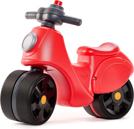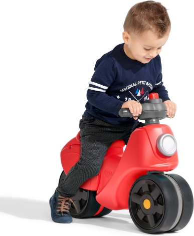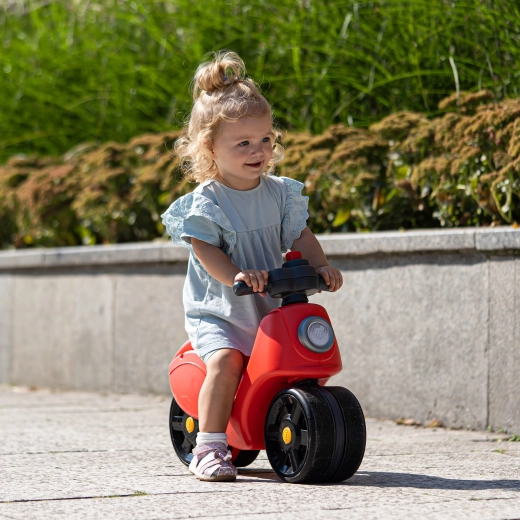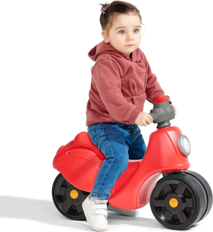Ta rdeči poganjalec v slogu skuterja prinaša otrokom stabilnost in zanesljivost zahvaljujoč velikim, širokim kolesom. Elastomerski površinski sloj na kolesih povečuje odpornost proti praskam in duši hrup, zato je vožnja gladka in prijetna. Otrok se pri odrivanju naravno uči ohranjati ravnotežje in izboljšuje svojo grobo motoriko.