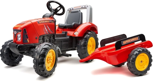 Otroški poganjalni traktor s prikolico Red Supercharger znamke FALK bo razveselil vsakega malega kmeta. Ponuja trpežno plastično konstrukcijo, odpirajoč se pokrov motorja z imitacijo motorja, trobento na volanu in odstranljivo prikolico. Zahvaljujoč verige na zadnji osi in krmiljeni sprednji osi je vožnja stabilna, varna in zabavna.