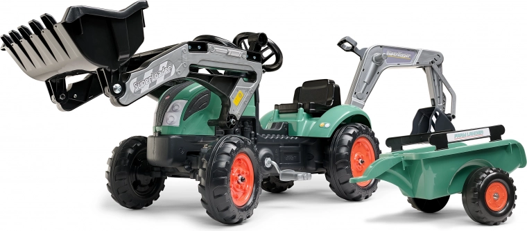Poganjalni traktor FALK s sprednjim nakladačem in prikolico je odlična izbira za male kmete, stare 2–5 let. Ponuja robustno izdelavo, funkcionalno premično žlico, hupo na volanu in varno, stabilno konstrukcijo. Izdelan je iz kakovostne plastike, deloma iz recikliranih materialov – idealno darilo za aktivno igro na prostem.