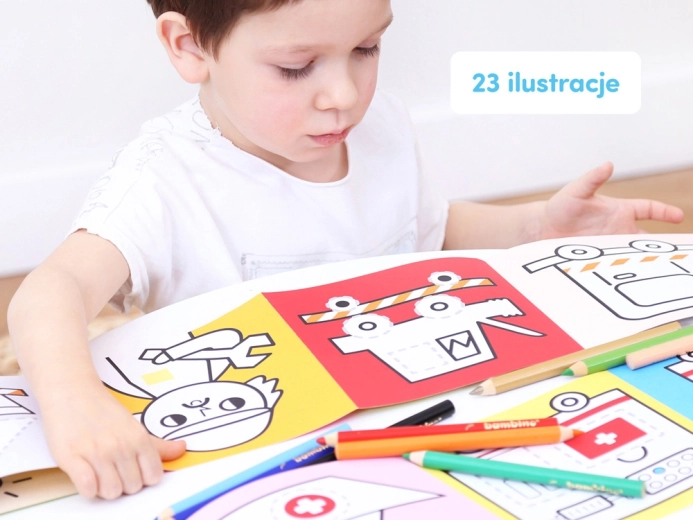 Vstopite v svet ustvarjalnosti z našim kreativnim kompletom, ki vsebuje dve dolgi harmonikasti knjižici z barvitimi vozili. Te zaokrožene ilustracije so prilagojene za male umetnike z navdušenjem nad risanjem in slikanjem.