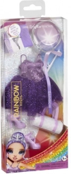 Vijolična obleka s tutu krilom, ujemajoči se čevlji in trak RAINBOW ustvarijo nepozaben baletni slog vaše punčke.
