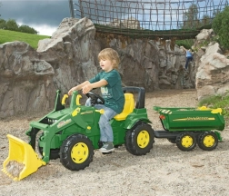 Otroška prikolica JOHN DEERE od ROLLY TOYS halfpipe je zasnovana za realistično kmečko igro. Zahvaljujoč dvojni osi je izjemno stabilna, ima veliko korbo za prevoz materiala in odpirajočo se zadnjo loputo za enostavno razsipanje tovora. Trpežna plastika in ikonične barve JOHN DEERE zagotavljajo dolgo življenjsko dobo in privlačen videz.