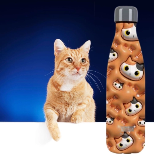 Slogovna termovka z motivom oranžne mačke pijače dolgo ohranja tople ali hladne. Zaradi kompaktnih mer je idealna za na pot, v službo in v šolo. Prostornina 500 ml, lahka zasnova in praktična oblika za udoben oprijem.