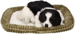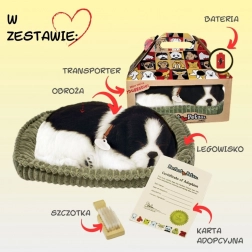 Ta verno izdelan plišasti kužek izgleda in deluje kot pravi mladiček. Mehka črno‑bela dlaka, ovratnica z obeskom in miren spanec z učinkom dihanja ustvarjajo pomirjujoče vzdušje za počitek in lažje uspavanje. Odličen za otroke, ki si želijo lastnega ljubljenčka.