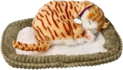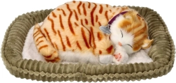Ta dihajoča plišasta mačka v izvedbi rdečerjave progaste muce deluje izjemno realistično – ima mehko dlako, prikupno ovratnico in mirno počiva v nežnem ležišču. Nežen gib, ki posnema dih, prinaša občutek miru in varnosti, zato je idealna kot tolažilni spremljevalec za otroke in odrasle.