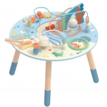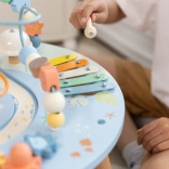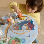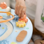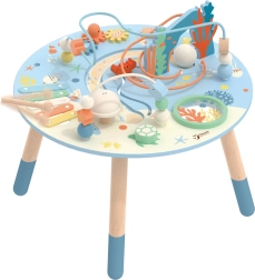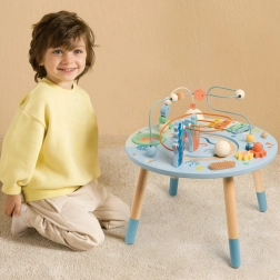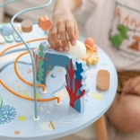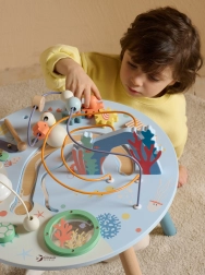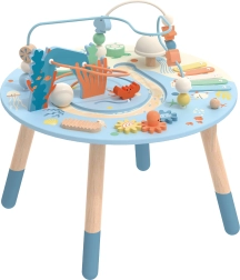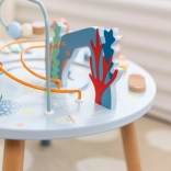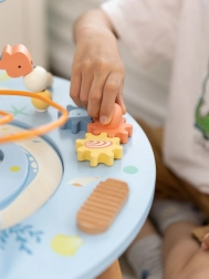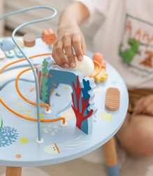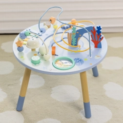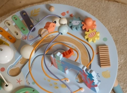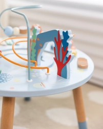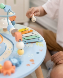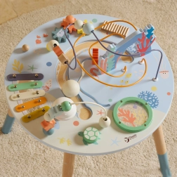 Lesena aktivnostna mizica Morsko življenje je odličen uvod v svet oblik in barv. Varna za najmlajše, izdelana iz kakovostnega lesa in barvana z nestrupenimi barvami. Otroke spodbuja k igri stoje, kar podpira njihovo koordinacijo in ravnotežje. Izobraževalne koristi te mizice so izjemne, bodisi pri izboljšanju fine motorike ali razvoju glasbenih veščin.