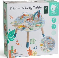 Lesena aktivnostna mizica znamke Classic World je idealna igrača za radovedne otroke! Polna barvitih atrakcij, kot so tri motorične zanke, zobniki, ksilofon in bobenček, prinaša veliko veselja ter hkrati pomaga razvijati pomembne veščine, kot so ročna spretnost, logično razmišljanje in gibčna koordinacija.