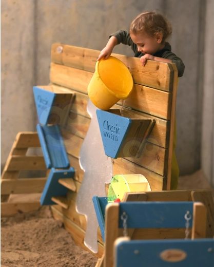 Odkrijte robusten zunanji panel za vodno in peščeno igro blagovne znamke CLASSIC WORLD, ki združuje interaktivne elemente in udobno klop. Zahvaljujoč kakovostnemu impregnirano borovemu lesu, netoksičnim obdelavam in zabavnim lijakom z mlinčkom in drčo ponuja čutno igro in učenje v enem. Idealno kot dopolnilo k peskovniku ali vrtnemu igrišču za otroke od 3 let dalje.