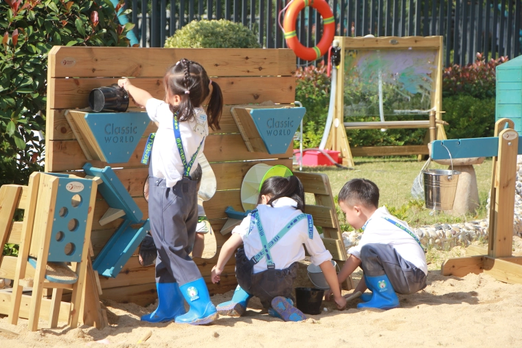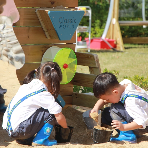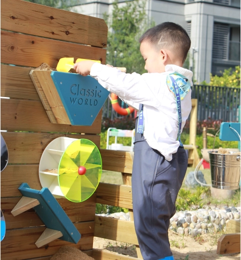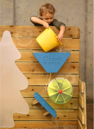 Ta lesena igra razvija fino motoriko, logično razmišljanje in kreativnost. Otroci lahko vsipajo pesek ali lijejo vodo v lijake, opazujejo, kako tok poganja vrtiljak in se steka po žlebovih, ter odkrivajo principe vzroka in posledice. Na sredini pritegne pozornost zrcalna folija v obliki drevesa, ki spodbuja čutno zaznavanje.