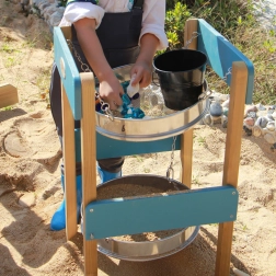 Postaja je enostavna za sestavo in pripravljena na intenzivno uporabo. Podpira fino motoriko, ustvarjalnost in domišljijo – otroci lahko razvrščajo kamenčke, školjke ali druge naravne materiale, odkrivajo teksture in ustvarjajo lastne mini poskuse. Odličen dodatek k igri s peskom in z vodo za dolge ure zabave in učenja.