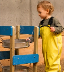 Dvojno sito CLASSIC WORLD EDU je premišljena postaja za senzorično igro, ki podpira učenje skozi eksperimentiranje. Dve kovinski siti z veliko površino sta obešeni na verigah, zato lahko otroci spremljajo proces presejanja, primerjajo materiale ter preizkušajo različne hitrosti sipanja ali polivanja z vodo. Zaradi čvrste lesene konstrukcije je komplet primeren za vsakodnevno uporabo v vrtcih in na javnih igriščih.