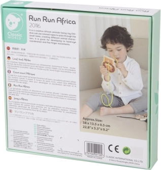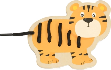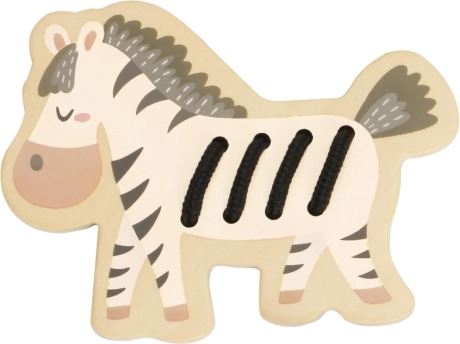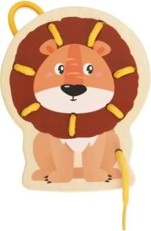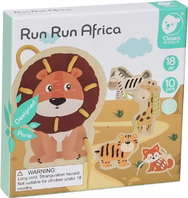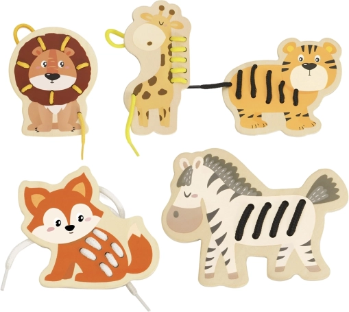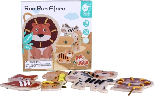 Set vsebuje 5 afriških živali (žirafa, lev, tiger, lisica in zebra) ter 5 barvnih vezalk. Gladki leseni deli z varno površino dobro sedejo v otroške roke, pisane barve pa spodbujajo prepoznavanje barv in poimenovanje živali.