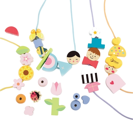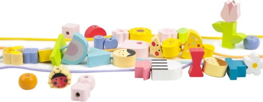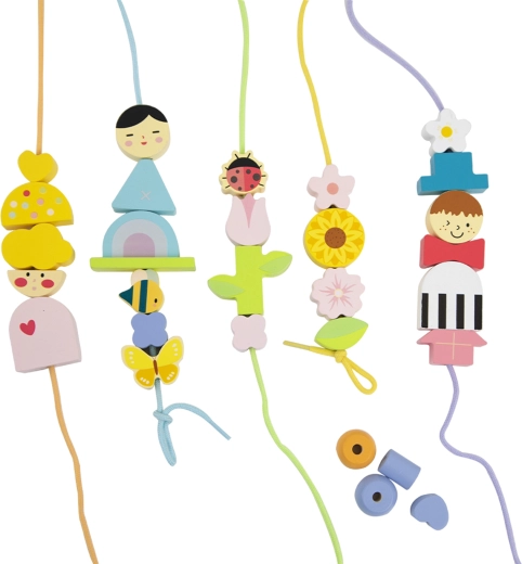 Raznolike perle v obliki cvetov, živalic in geometrijskih oblik spodbujajo otroke k nizanju, razvrščanju in ustvarjanju lastnih vzorcev.