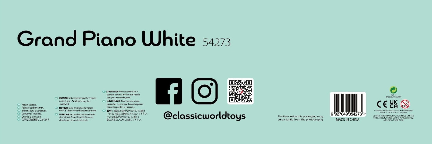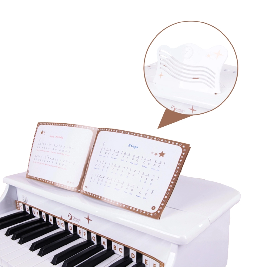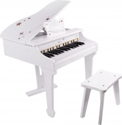 Otroški beli klavirček CLASSIC WORLD ponuja pristno izkušnjo igranja na pravi instrument v varni in igrivi obliki. Zahvaljujoč leseni konstrukciji, stabilni stolčki in notnemu stojalu bodo mali glasbeniki uživali v udobnem sedenju ter osvojili pravilne navade pri igranju. Priložena ilustrirana notna knjižica olajša prve melodije.