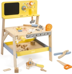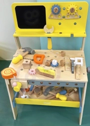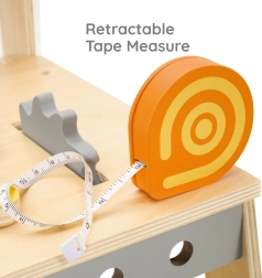 Lesena delovna miza je idealna igrača za male mojstre. Otroci lahko privijajo, zabijajo, merijo in sestavljajo zobnike, ob tem pa razvijajo ročne spretnosti in logično razmišljanje. Vgrajena kredna tabla je odlična za skice in ideje za nove projekte.