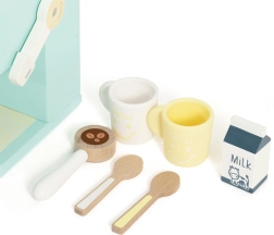 Ročica, vrtljivi gumbi in dodatki otrokom omogočajo posnemanje priprave kave kot v pravi kavarni.