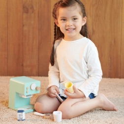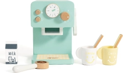 Privoščite malim baristom avtentično izkušnjo priprave kave. Ta lesen kavni aparat v turkizni izvedbi deluje realistično zahvaljujoč ročnemu upravljanju z ročico in vrtljivemu gumbu z mehanskim zvokom. Skrbna izdelava brez ostrih robov in kakovosten naravni les zagotavljata trajnost in varnost.