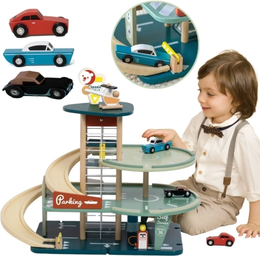 Stilsko leseno parkirišče, navdihnjeno s 50. leti, znamke CLASSIC WORLD prinaša tri nadstropja zabave z dvižno ploščadjo, spiralnim bioplastičnim klančinom, avtomobilčki, avtopralnico, bencinsko postajo in heliportom. Kakovostni materiali z FSC certifikatom spodbujajo fino motoriko, domišljijo in družabne spretnosti otrok od 3 let dalje.