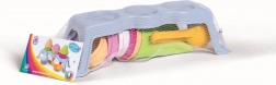 Praktično pakiranje v mrežici se zlahka prenaša in pospravlja. Zahvaljujoč stojalu imajo otroci vse pri roki in se lahko igrajo slaščičarno. Komplet je primeren od 10 mesecev in zaradi zaobljenih oblik odlično sede v otroške roke.