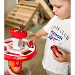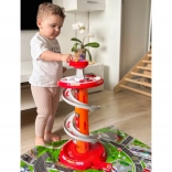 Zavrtite zabavo z večnadstropnim gasilskim parkiriščem WOOPIE! Stabilen stolp s spiralno rampo omogoča gladek in hiter spust avtomobilčkov z vrha do baze. Otroci vadijo fino motoriko in domišljijo, ko se podajo na posredovanje po označeni izvozni trasi in po prometnih znakih.