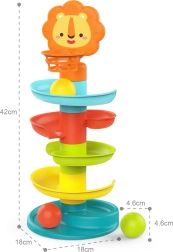 Ta barvit spiralni stolp pomaga razvijati motorične spretnosti, koordinacijo in natančnost vaših otrok. Pet ravni zagotavlja dolgotrajno zabavo, medtem ko ljubki lev na vrhu lahko navdihuje otroke k ciljem in izboljšanju njihovih sposobnosti. Žogice vsebujejo drobne elemente, ki oddajajo zvoke in ponujajo dodatne senzorične dražljaje. Igrača je narejena iz varnega in preizkušenega plastike za maksimalno varnost majhnih igralcev.