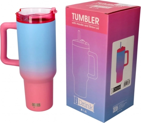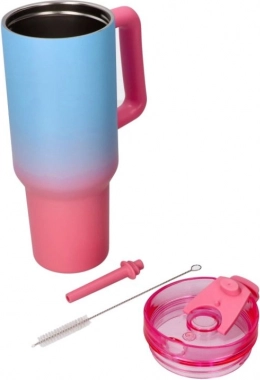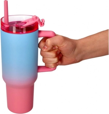 Odkrijte udobje velikega termovrča s slamico, ki združuje veliko prostornino 1200 ml z lahkim in praktičnim izvedbo. Zahvaljujoč pokrovu s slamico pijete udobno tudi na poti, medtem ko udoben ročaj olajša prenašanje. Trendovski modro‑rožnat ombré dizajn doda šarm vsakemu dnevu.